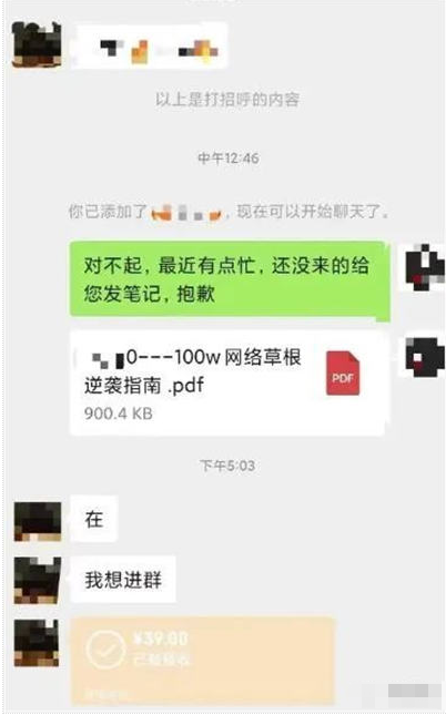 粉丝数1000以下最好不要有任何营销动作。粉丝1000后,号成功。然后在粉丝群里留下联系方式,引至微信。基本上就是发个东西,让别人加你微信。加了之后,你发的基本都是一些思维类的东西。然后在文件里说:我有一个付费社区,收费39.9元。每天分享什么,获取一些分享案例等等。分享信息很好找,某宝每天晚上都能买到低价的分享信息。