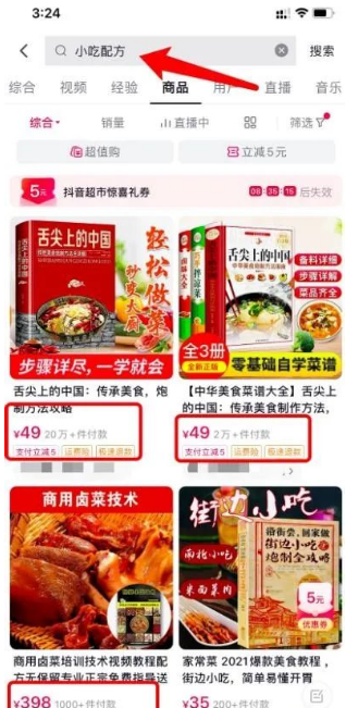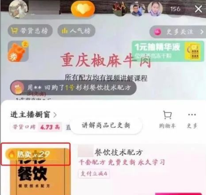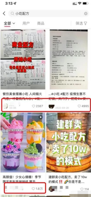 另外一种则是通过直播的形式进行变现,目前直播出售教程的也有不少,随便在某一个平台搜索“小吃配方”就能看到一大批账号,下面简单看一个账号的成果: