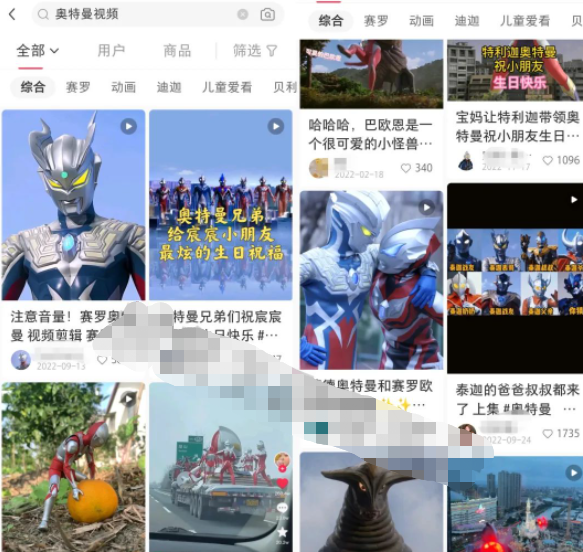 2、可以开始找素材,很多一开始不会录屏的,可以选择在抖音或、某手、某书去搜索一下奥特曼素材,找到孩子喜欢的奥特曼,这个很耗时间,就是要一条条去找。