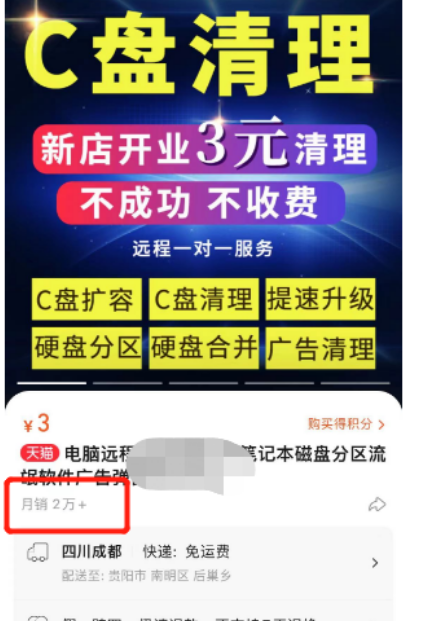 除了系统重装,一个引流款的C盘清理,一单3块,需求也真的不少,这个操作和装系统原理都差不多。C盘清理为什么会有需求,特别是对于女孩子用电脑,下啥子软件基本都是装C盘,到一定时候整个C盘就一条红线,卡爆了。