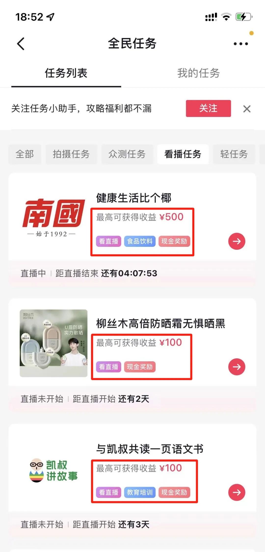 每一个看直播的任务都会有必须要完成的要求,在做任务之前记得先把要求看清楚,达到要求才会有收益的