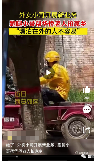 除了代扫墓,这两天还看到一个很有意思的业务,帮客户拍摄老家的房子,拍视频拍照片,一个外卖小哥突然接到的订单,顾客长期生活在国外,家里老人很想念家里老房子,就想了这个办法让美团小哥帮忙拍房子视频图片发过去