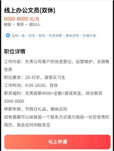 招聘内容类似于下图这样,不绝对,但是很多骗子也这么发: