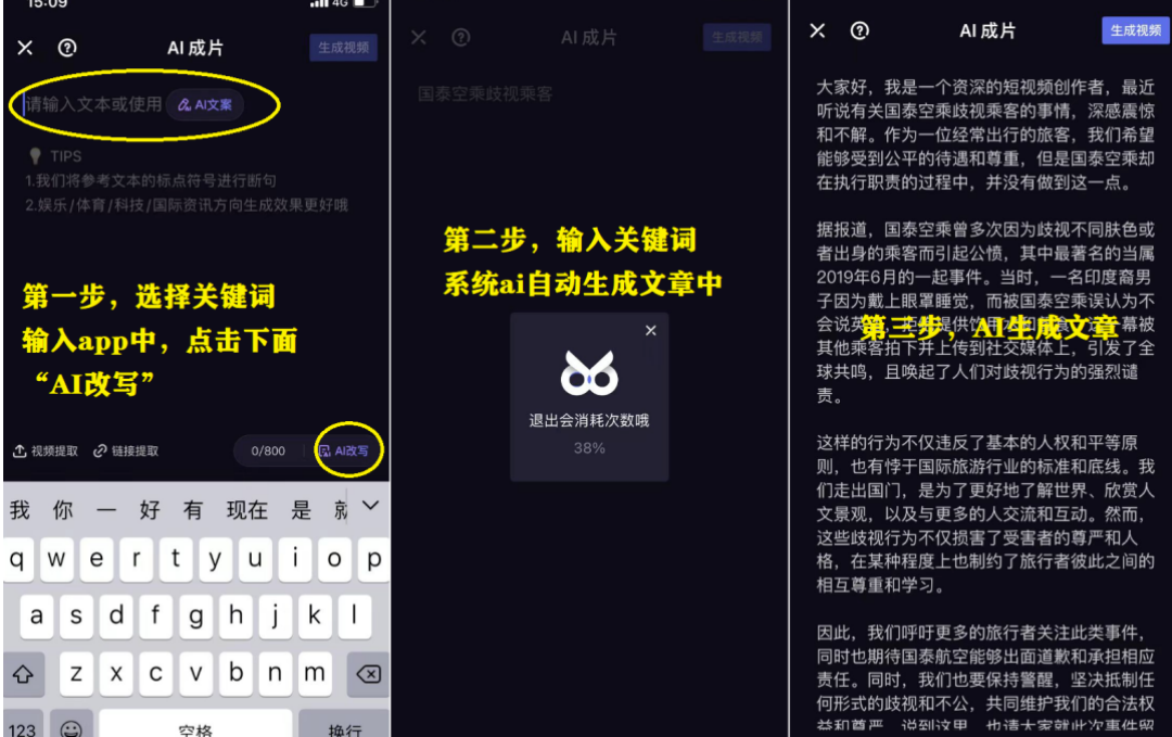 我们进入“AI成片”,然后输入关键字后AI自动生成文章,如下: