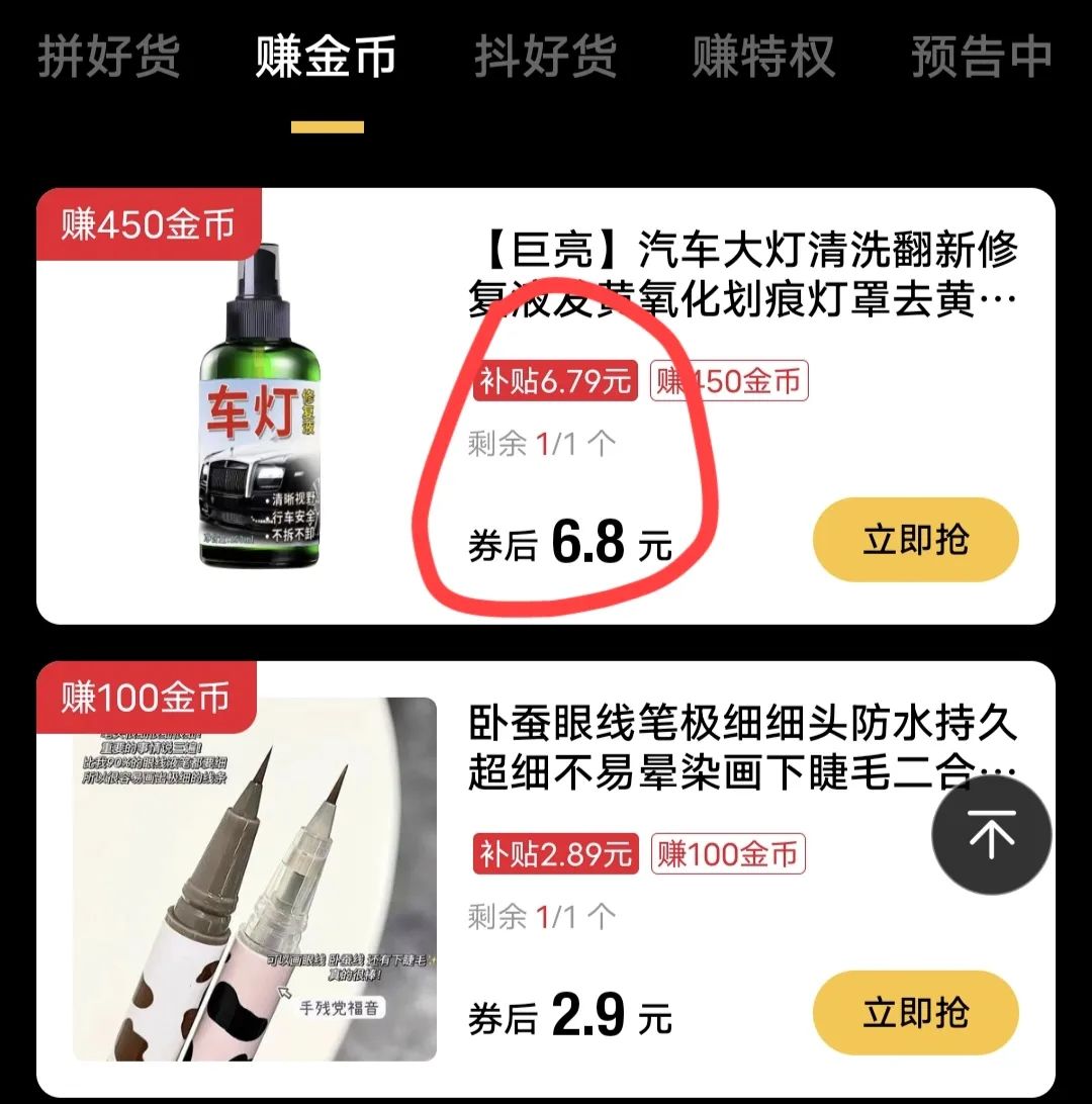 如图所示,通过app跳转到拼夕夕或者抖音购买商品,6.8的商品收到货以后会返6.79,相当于1分钱撸货,亲测发的都是实物。还是很靠谱的一个APP。