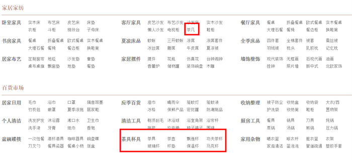 这里可以看到,淘宝把“茶”相关的,拆分成:茶叶类,饮料类……