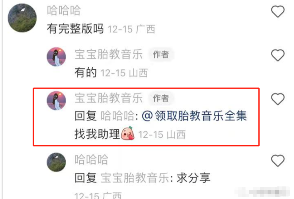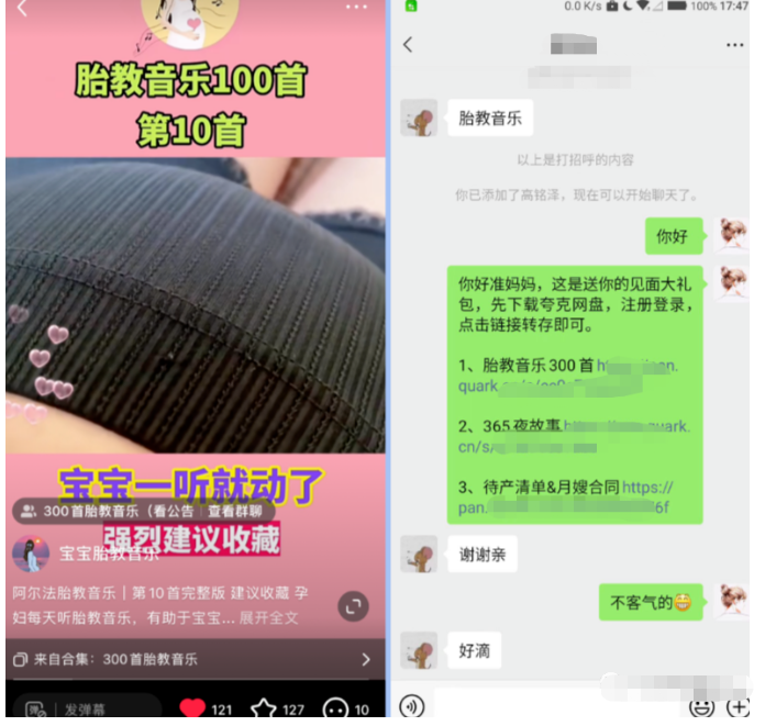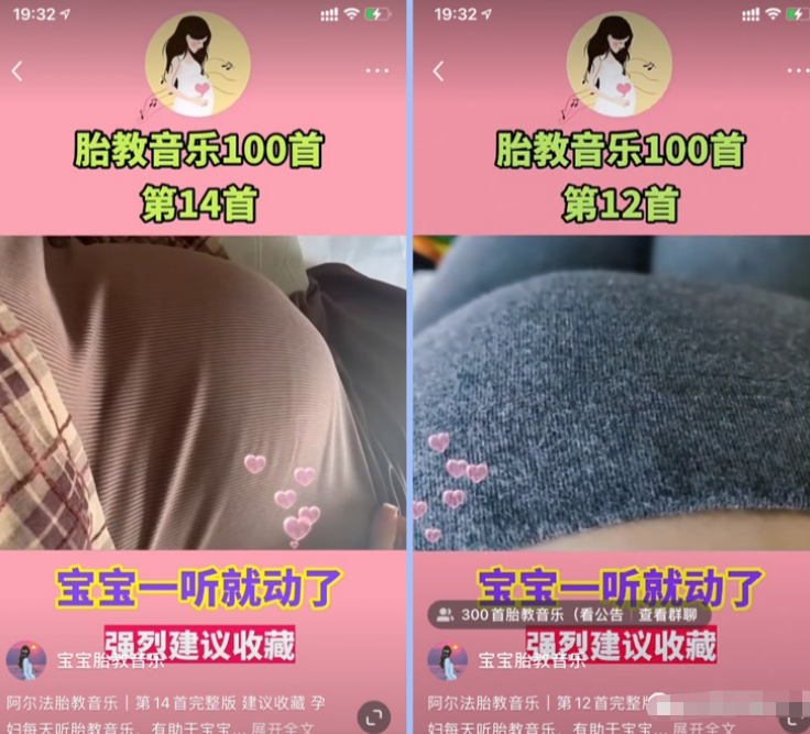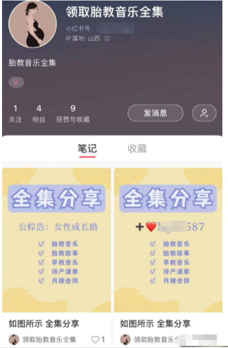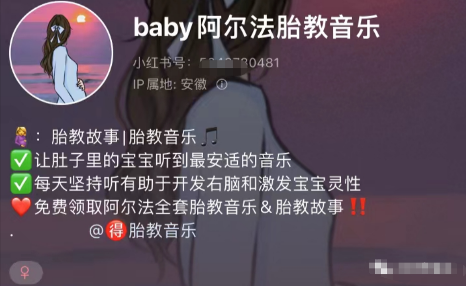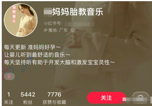想必都知道某红书这个平台,女性用户占比高达百分之七十以上,我们可以利用在某红书发布胎教音乐视频,吸引孕妇人群关注,通过送胎教音乐的形式引流到私域。前期通过网盘拉新变现,后期结合母婴购物群二次变现,可长期盈利。
