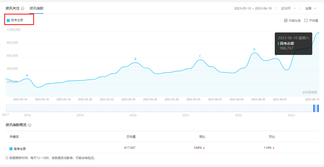 高考之后,每一个学子都会为选择读哪所高校、选择哪个专业而发愁,让一群没有工作经验的学生,来决定自己未来的工作专业很难,所以有痛点就有商机,就衍生出来了高考志愿咨询服务,在某度指数搜索这个关键词,可以看到自己的热度直线上升。