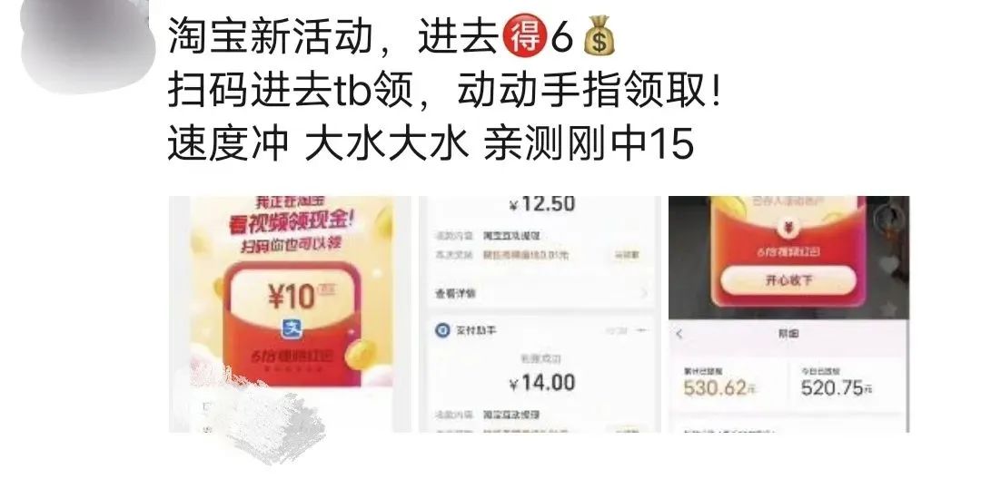 不知道大家的朋友圈有没有分享类似这种文案的,比较吸引人的就是放上二维码,,加一张10块左右的提现截图,然后配上文案淘宝扫码直接提现10之类的话术,只要有一个人扫了,你可以获得0.5-10块收益,大多是一、两块,收益多少取决于扫码的人多久没有登录某宝。