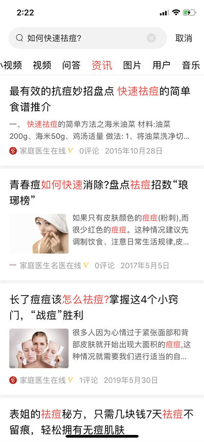 首先进入今日头条,我们要通过搜索关键词的形式去寻找鱼塘,千万不要直接搜索:祛痘、祛痘产品之类的,否则你找到的都是同行,而同行的群是很难混进去的,或是粉丝质量是很差的,因为粉丝们早被割得体无完肤了……