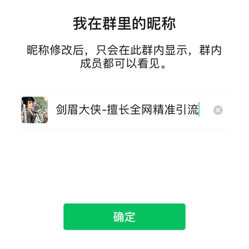 有些群里可能管得没那么严,你想在里面混群引流,你可以偶尔发言一下,那么如何发言呢?其实很简单。首先你要修改一下群名片,改成一个可以吸引到精准用户的名字。比如我混进了一个WZ创业类型的微信群,我可以把我的群名片改成:剑眉大侠-擅长全网精准引流。