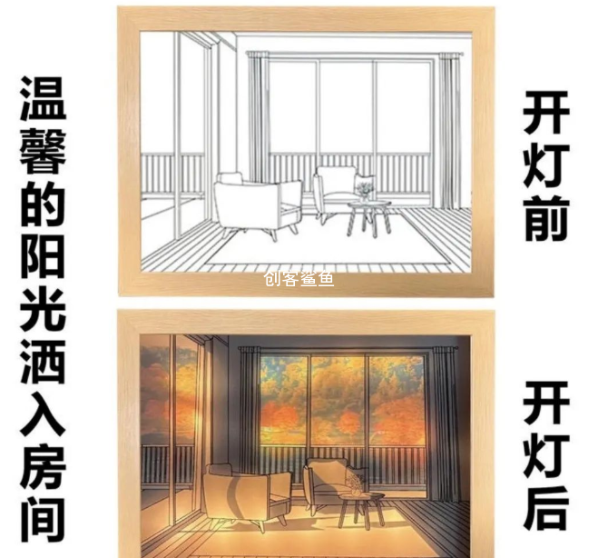 不知道大家有没有在某视频平台刷到过一个爆火的小物件,就是下图的这种灯光画,单看没有啥吸引力,但是一打开灯光,效果马上就不一样了,非常的有意境。