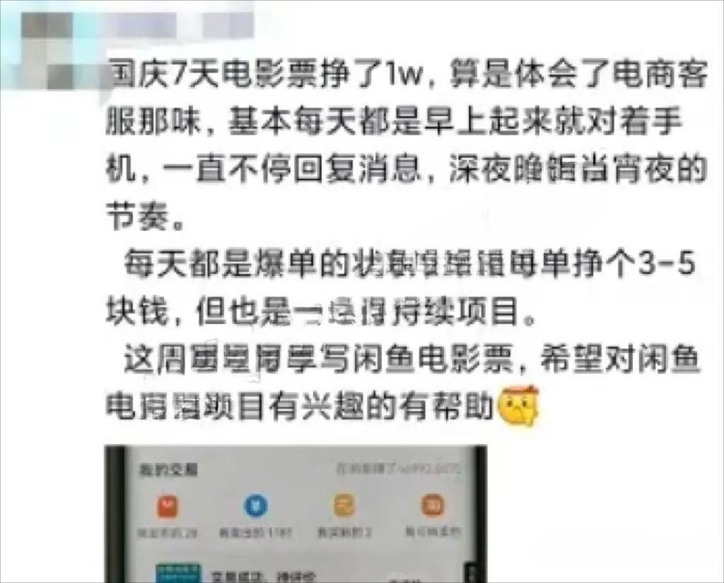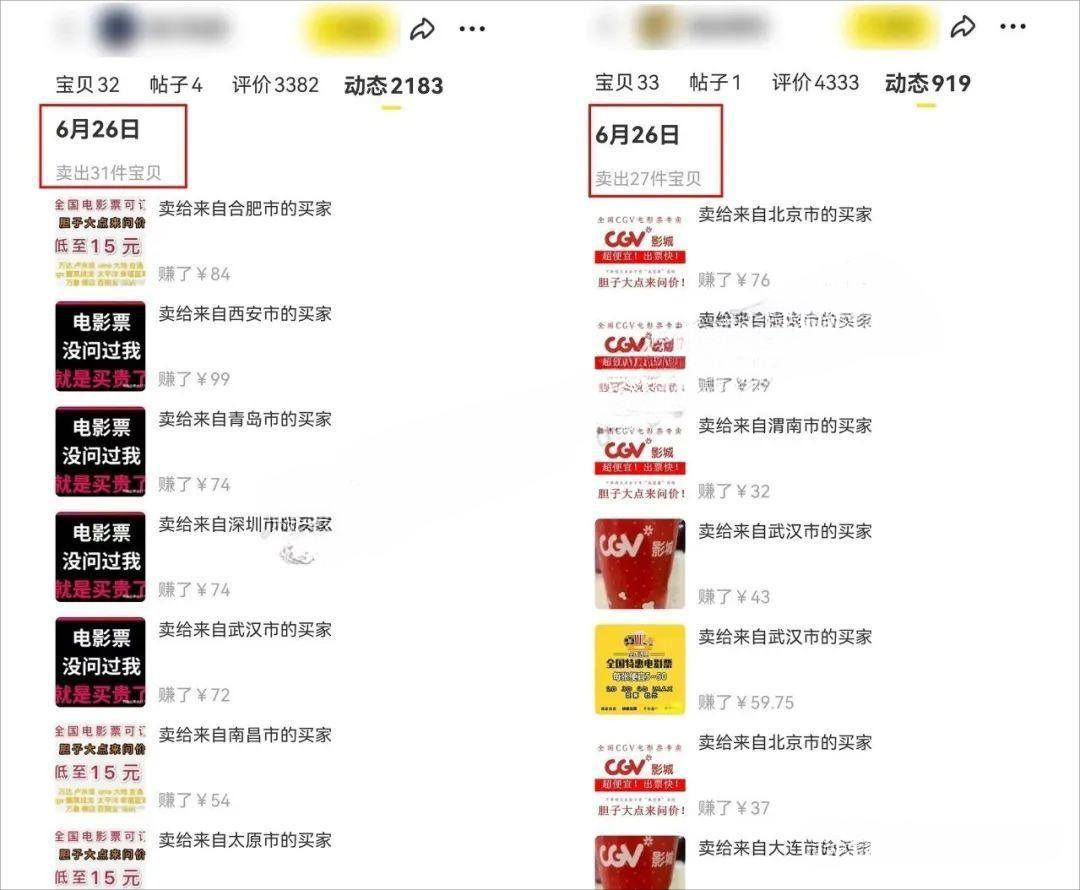 他们通过这些渠道购买了大量低价电影票,然后在闲鱼等二手交易平台上高价售卖,从而赚取差价。虽然每一单的利润可能只有几块甚至十几块钱,但由于他们大量操作,这样的收益仍然非常可观。