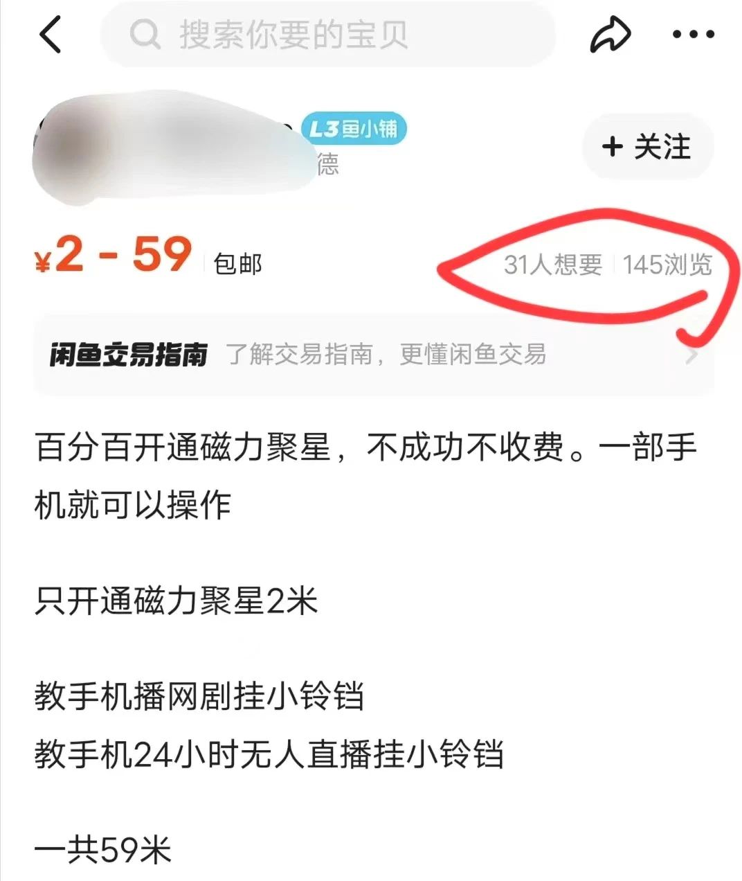 你只要上架商品,平台就会给你初始流量,流量推送机制跟短视频一样,越受欢迎流量就越高。 只要做互联网的朋友,基本都接触过这个咸鱼电商平台,之前唐哥也去尝试做了做,效果还非常不错,一天搞小零花钱还是没有问题的。 如果你想把收益放大,肯定是需要去做矩阵的,但是做矩阵太累了,那时候唐哥也就没有继续去操作了。 这里给大家推荐一些操作思路,可以先看看,感觉适合直接去实操看效果! 首先,这个咸鱼平台基本上什么东西都能上架,不管你是虚拟还是实物,但是今天主要是讲虚拟商品,因为做虚拟基本上没有什么成本,一份教程无限出售。 虚拟教程案例讲解: 前面几天看到一篇文章,主要是讲快手磁力聚星开通教程,然后发现咸鱼居然有人在卖,虽然说单价不高,一单就2-3元,但是我发现基本上每个店铺都有开单。