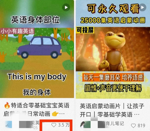 今天给大家讲一个搬砖带货玩法,是关于育儿动画方面的一个玩法案例。我在这个视频号上面看到有这么一个博主,做的是热门萌娃英语视频,加上英语动画搬运。