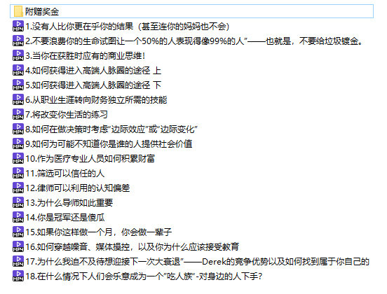 学习完这套课程你会了解到高端人脉需要什么样品质的伙伴,如何才能够建立良好长期的共赢合作关系,如何教育自己成为一个这样的人,以及学习到各种决策策略,认知偏差,商业思维等等