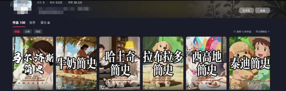108条作品,收获5.0万粉丝,点赞28.3万: